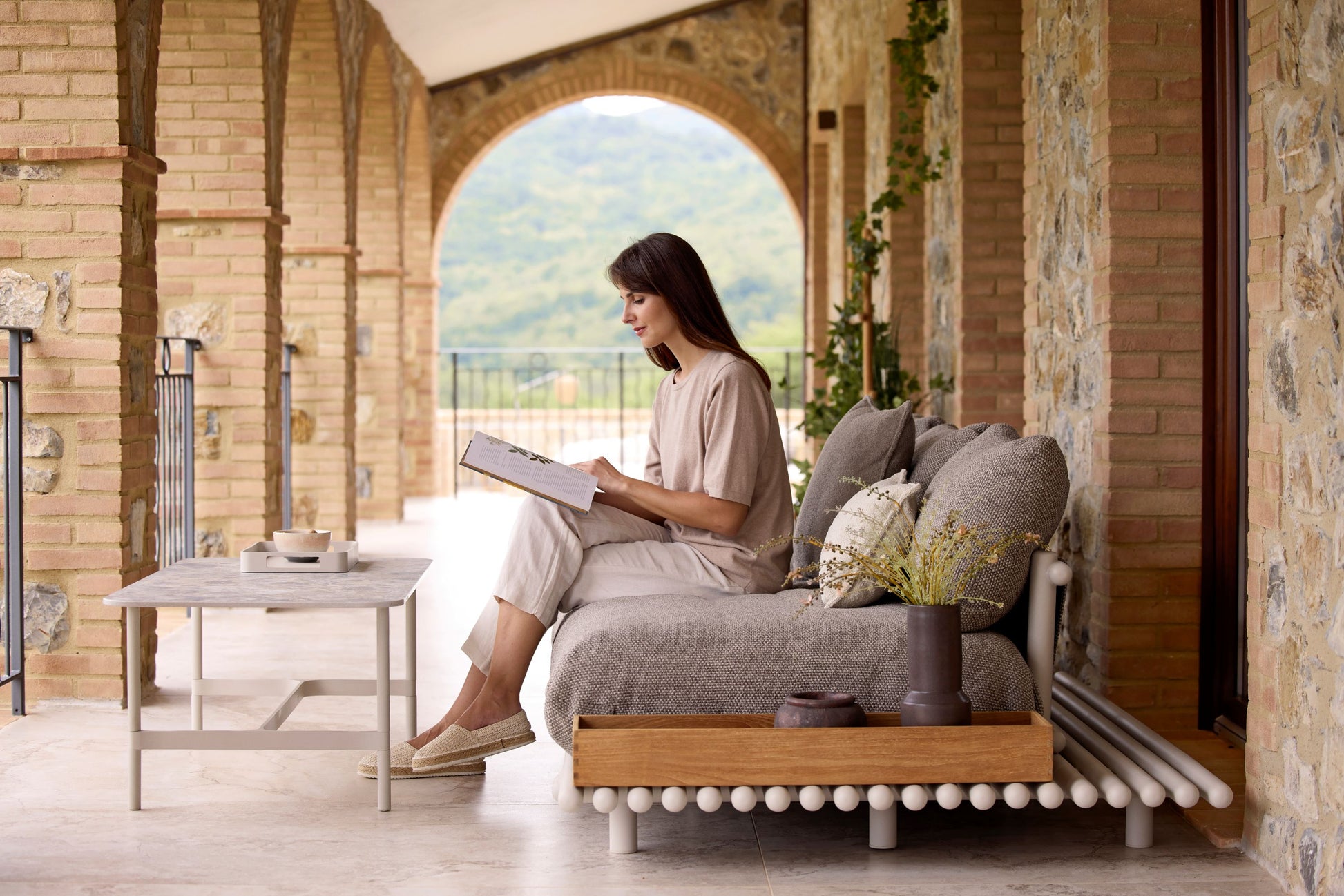 Le design modulaire du canapé permet d’ajouter différents accessoires de la collection Sticks, tels que des plateaux de table ou des coffres de rangement, afin de composer un espace extérieur personnalisé, fonctionnel et évolutif.